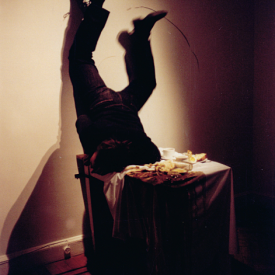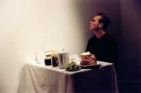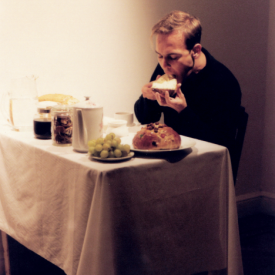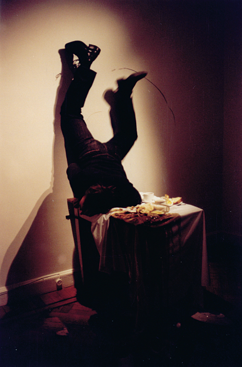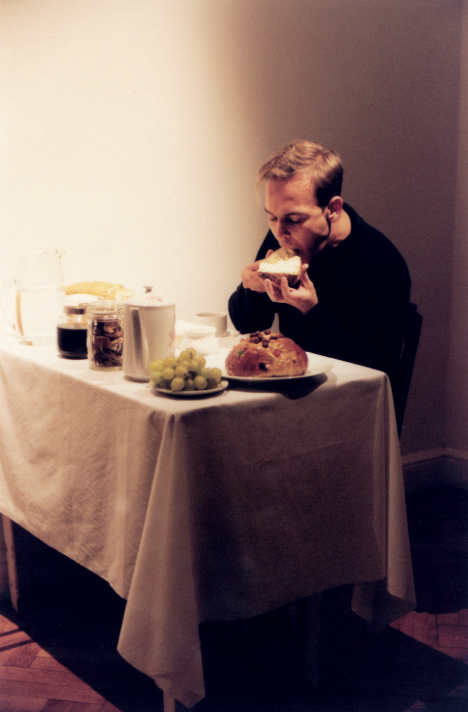 *A performance Café da manhã foi criada especialmente para um evento de performance na galeria Outline, em Amsterdam, em 2001. Nas palavras do artista: “a ideia era criar uma momento de monotonia e cotidiano, que se desfaz quando decido fazer um movimento. A situação trabalha com a energia cósmica, do caos, onde, a partir de uma mudança, tudo se transforma”. O vídeo, gravado e editado pelo próprio artista, é parte do acervo HIPOCAMPO (versão reduzida) e foi realizado na Rijksakademie van Beeldenden Kunsten, em Amsterdam, também em 2001. A performance Café da manhã, cuja duração varia entre 10 e 20 minutos, também já foi apresentada em 2015 na exposição Cotidiano Radical, na Caixa Cultural, no Rio de Janeiro; e entre 2001 e 2005, na Paraplu Fabrik (Arnhem/Holanda), no Centro Cultural UFMG (Belo Horizonte), no CEIA (Belo Horizonte), na galeria do Coletivo Duplus (Argentina), em Durban (África do Sul), na Galeria Vermelho (São Paulo), no Museu Chácara Dona Catarina (Cataguases) e no Panorama da Arte Brasileira (MAM/São Paulo). As fotografias que integram essa publicação foram tiradas na galeria do Coletivo Duplus, por Ignacio Asparras.