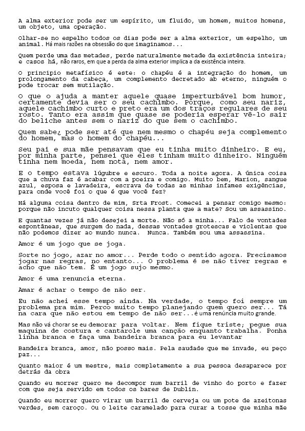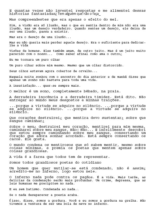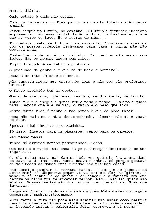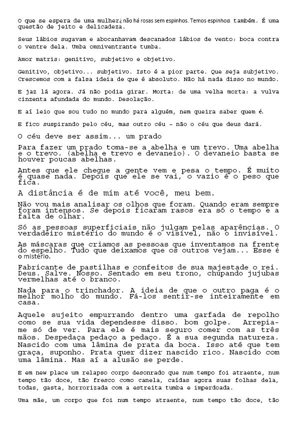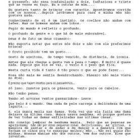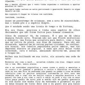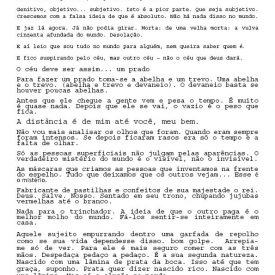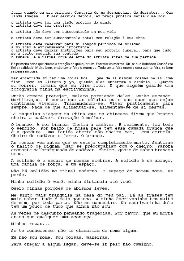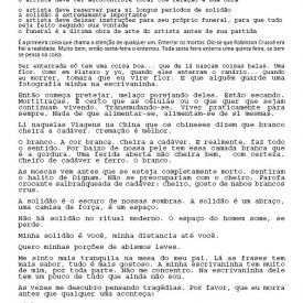 Um Especulado Back 06/06/2022 by Camila Romano   Document HIPO.0137.1 Download Attachments HIPO.0137.0002_textos lidos HIPO.0137.0003_textos lidos2 HIPO.0137.0004_textos lidos3 HIPO.0137.0005_textos lidos4 HIPO.0137.0006_textos lidos5 HIPO.0137.0007_textos lidos6 HIPO.0137.0008_textos lidos7 Metadata Thumbnail Share Número de tomboHIPO.0137TipologiaObraNome artístico Sofia Bauchwitz Data de nascimento 16/09/1988 Estado de nascimento Rio de Janeiro (RJ) País de nascimento Brasil (BR) Site www.sofiabauchwitz.com TítuloUm EspeculadoData2011CategoriaTexto | VídeoDescrição, técnica e suporteVídeo e textoFormatojpg | mp4Dimensão00:03:11 / 259 MB (Vídeo); 0,98 MB (Texto)Partes8Palavras-chaveTexto | VídeoNaturezaDigital Continue browsing Twilight Zone La caza Back to items list